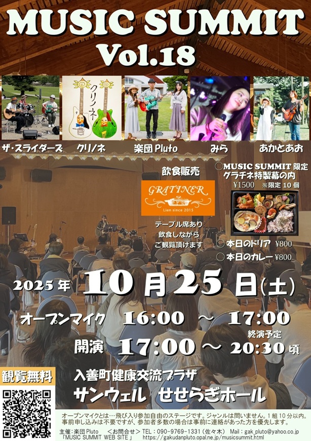 ザ・スライダーズ(インストバンド) クリノネ(ギターボーカルデュオ) みら(ボーカル&ピアノ) あかとあお(アコースティックデュオ) 楽団Pluto(アコースティックユニット) |